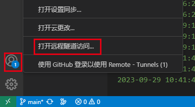 此方法需首先在远程服务器上安装完整的VSCode桌面版,具体启用方法如下。 在远程服务器上的VSCode账户菜单中,选择“Turn on Remote Tunnel Access”选项。