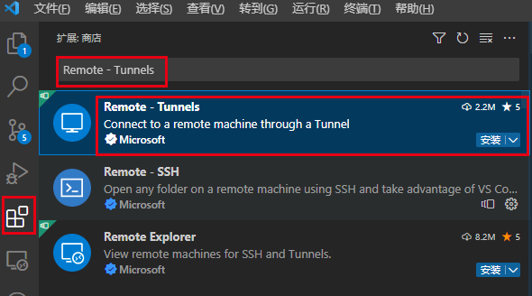 点击左侧的扩展按钮(或用 Ctrl+Shift+X),搜索插件Remote - Tunnels进行安装
